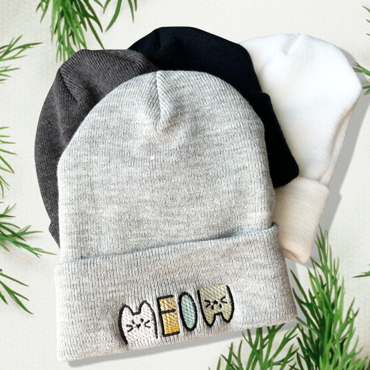 Embroidered Cat Meow Unisex Cozy Cute Winter Cuffed Knit Beanie Hat Special Gift