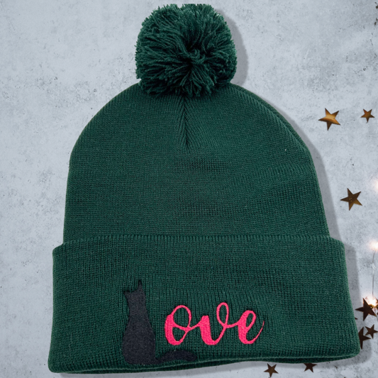 Embroidered Cat Love Unisex Cozy Cute Winter Pom Pom Cuffed Knit Beanie Hat Special Gift
